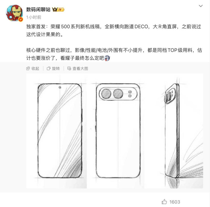 栏目分类荣耀500 系列外观设计曝光, 采用横向镜头模组设计